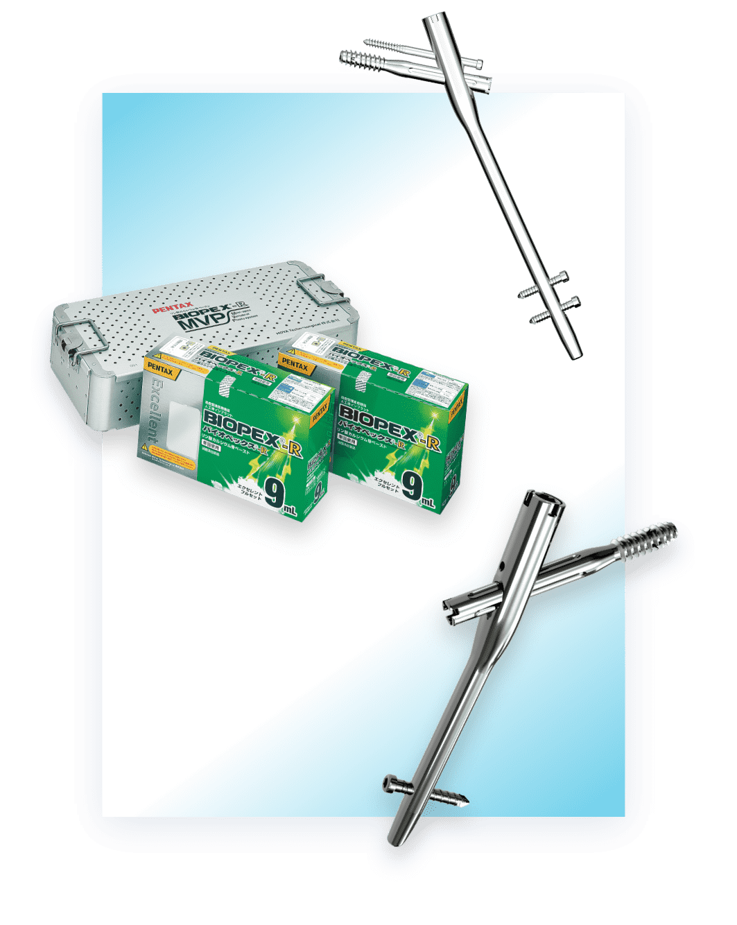 セラミックス製インプラント、金属製インプラント製品に加え、椎体骨折用手術器械の開発や脊椎インプラントの販売まで国内一貫体制でお届けしています。