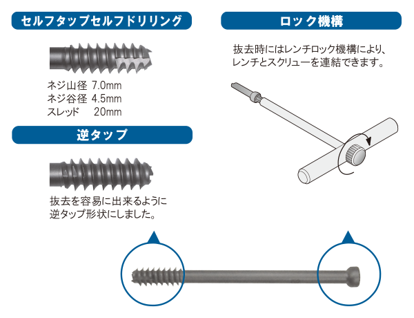 セルフタップ、リバースタップにより挿入、抜去ともにスムーズに行うことができます。
