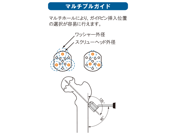 マルチプルガイドを使用することにより、ガイドピン刺入位置の選択を容易に行えます。