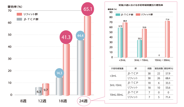 X線画像を用いて骨形成を評価した結果、術後18週以降において、リフィット群のβ-TCP群に対する優越性が示された。また、術後24週における手術時補填量別の著効率を比較すると、リフィット群では補填容量に依存することなく、いずれの補填容量においても著効率は50%以上であり、補填容量:10mL-30mLでは著効率71.4%であった。一方、β-TCP群は補填容量が増加すると著効率が低下し、補填容量:10mL-30mLでは著効率0%であった。