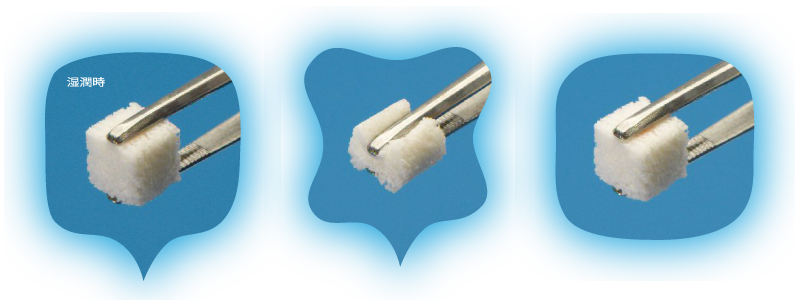 湿潤時にスポンジのような弾力性を有しているため、患部に隙間なくフィットすることができます。また、メスやハサミなどで容易に加工ができます。