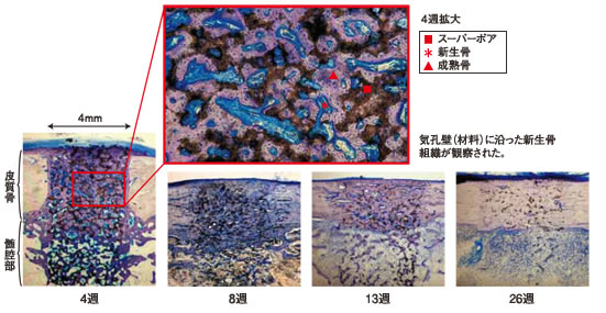ビーグル犬大腿骨にスーパーポア(気孔率約75%、直径4mm×長さ12mmブロック)を埋植、4、8、13及び26週後に摘出し、トルイジンブルー染色標本を作製・観察。(埋植試験はISO10993に準拠し、GLP水準施設にて実施した)