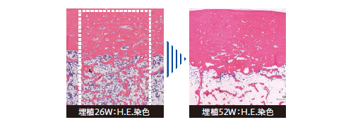 ビーグル犬大腿骨にΦ4×L12mmの骨欠損を作製、同形状のスーパーポアEXを埋植、26週及び52週後に摘出し、脱灰H.E.染色標本を作製。埋植試験は、ISO10993に準拠し、GLP水準施設にて実施しました。